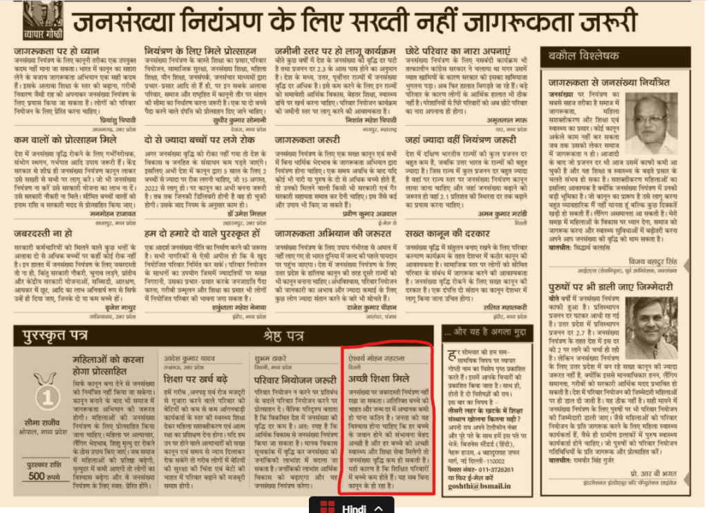 इसी विषय पर मेरा एक पत्र बिज़नेस स्टैण्डर्ड हिंदी के दिल्ली संस्करण में दिनांक २६ जुलाई २०२१ को प्रकाशित हुआ है: