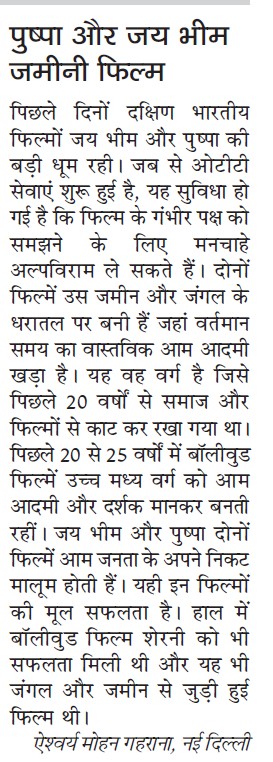 पिछले महीनों में दक्षिण भारतीय फ़िल्मों “जय भीम” और “पुष्पा” की बड़ी धूम रही| यह तक कहा गया कि यह बॉलीवुड नामक हिन्दी फ़िल्म फॉर्मूला का अंत है| सोचा, अगर इतनी बड़ी क्रांति होने जा रही तो साक्षी बन लेना ही बेहतर है|